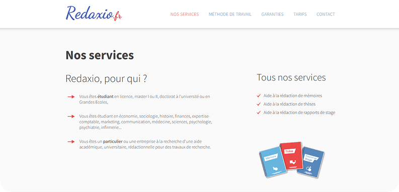 Redaxio présente plusieurs catégories principales de services académiques. Sur le site, les prestations mises en avant sont : l’aide à la rédaction de thèses, mémoires et de rapports de stage. Ces services sont offerts aux étudiants de différents niveaux académiques et de différentes filières.